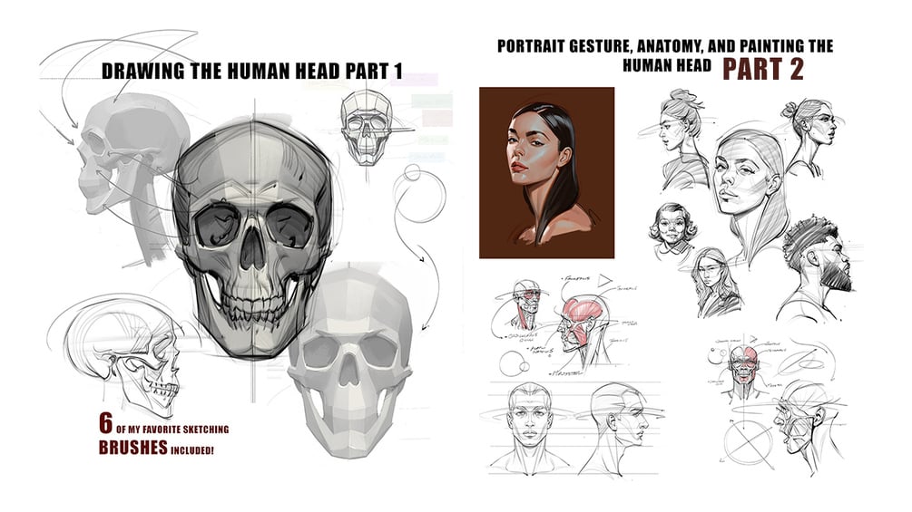 Learn my approach to drawing and painting the human head with this bundle package of my Part 1 and Part 2 head drawing tutorials! I include both tutorials and all the respective brushes. It's a total of almost an hour and a half of content! I include painting demo, several portrait gesture demos, and 4 caricature demos, my approach to drawing the male human head front view and profile including the profile and front view of the human skull! Hope you enjoy!
