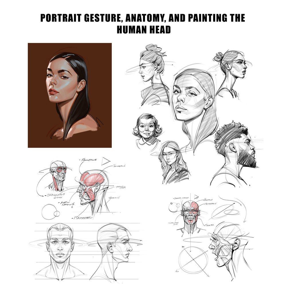 You'll get my process of drawing the front and profile of the male head, a quick review of facial muscle anatomy, several demos of portrait gesture, and caricatures, and a process video on my approach to portrait painting!